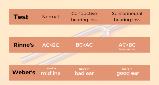 Diagnostic tests include otoscopy, tuning fork tests (Rinne and Weber) and diagnostic audiometry.