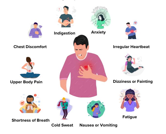 At times, prodromal (premonitory) symptoms are experienced as actual events, but at other times no early warning signs are noted. Prodromal symptoms can be characterized as increasing angina, shortness of breath, and fatigue. Acute MI produces symptoms of deep, substernal, visceral pain (internal aching or pressure), often with radiation to the shoulder, neck, back, jaw, teeth, or left arm. Nausea and vomiting, sweating, and shortness of breath may accompany the symptoms. One-third of the MIs are clinically unrecognized, and representative of silent MIs.
