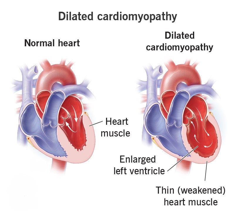 Dilated - This form is associated with excessive drinking of alcohol, chemotherapy for cancer, viral infections, acquired immunodeficiency syndrome (AIDS) infection, recurrent myocardial infarction (MI), and unknown factors.