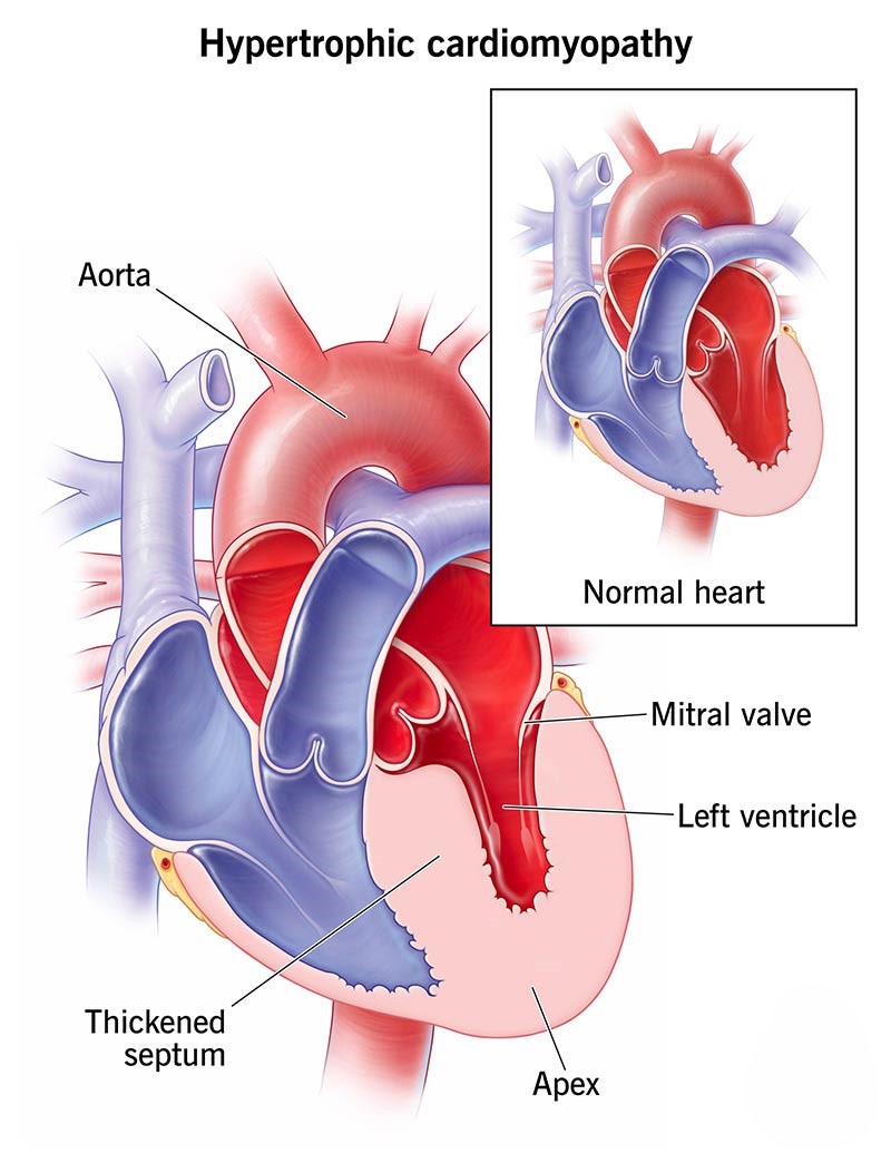 Hypertrophic - In this form, the myocardium is thickened. This form is also hereditary in over 50% of cases, or there are unknown factors.