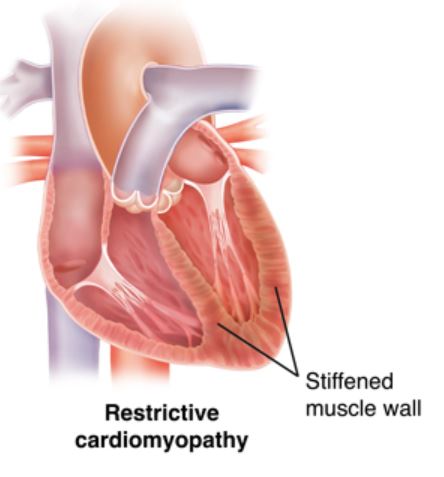 Restrictive - In this form, the muscle is infiltrated with disease such as amyloidosis, hemachromatosis, and glycogen storage disease, or the cause is unknown.