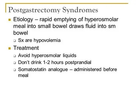 Possible complications from gastric surgery are: recurrent ulceration; bile reflux; dumping syndrome (see Diagnostic Code: 7308 Postgastrectomy syndromes); postvagotomy diarrhea; Vitamin B12 deficiency; anemia; osteomalacia and osteoporosis; and general malabsorbtion syndrome.