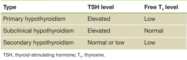In primary hypothyroidism, thyroid-stimulating hormone (TSH) levels are elevated. Laboratory data reveal a low level of circulating TSH in secondary hypothyroidism. Other pituitary hormone levels and the levels in their analogous tissues may be low in secondary hypothyroidism. The thyrotropin-releasing hormone (TRH) test may be useful in differentiating between secondary hypothyroidism caused by pituitary failure or hypothyroidism caused by hypothalamic failure. When hypothyroidism is caused by hypothalamic failure, TSH is released in response to TRH. The thyroid hormone levels of T3 and T4 are also evaluated when diagnosing hypothyroidism. In more severe hypothyroidism, both serum T3 and T4 levels are decreased.