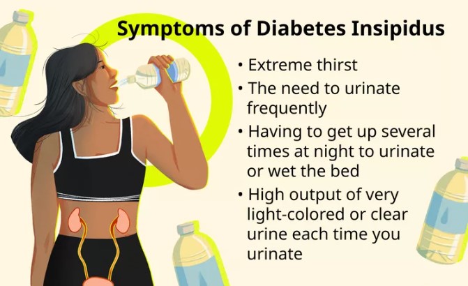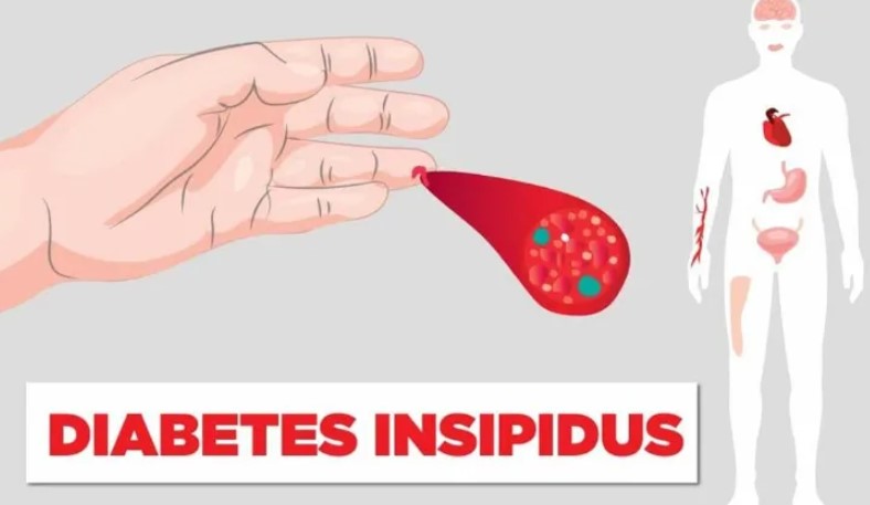 Diabetes insipidus (DI) occurs when there is a deficiency of the antidiuretic hormone (vasopressin) due to a disorder of the hypothalamus and the pituitary gland. The result is polyuria and polydipsia.