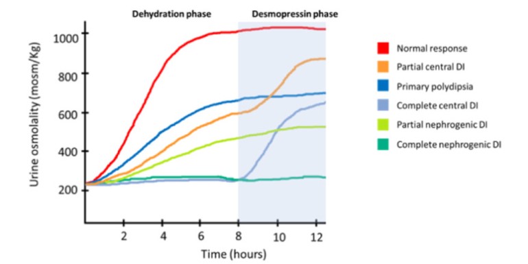 The most reliable test is the water deprivation test. A normal response to water deprivation is one in which urine concentration would exceed plasma concentration. This does not occur in DI.