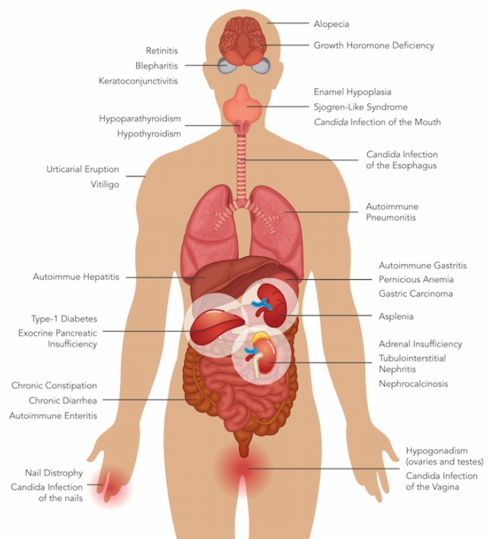Type 1 which occurs before age 35, but is usually recognized in the first decade of life. The glands that fail most frequently are the parathyroids (hypoparathyroidism), and the cortex of the adrenal gland. After puberty, over 50% of women lose function of the sex glands; men are in the 15% category for this loss of function. Chronic yeast infections of the mucous membranes and the skin are common (mucocutaneous candidiasis).