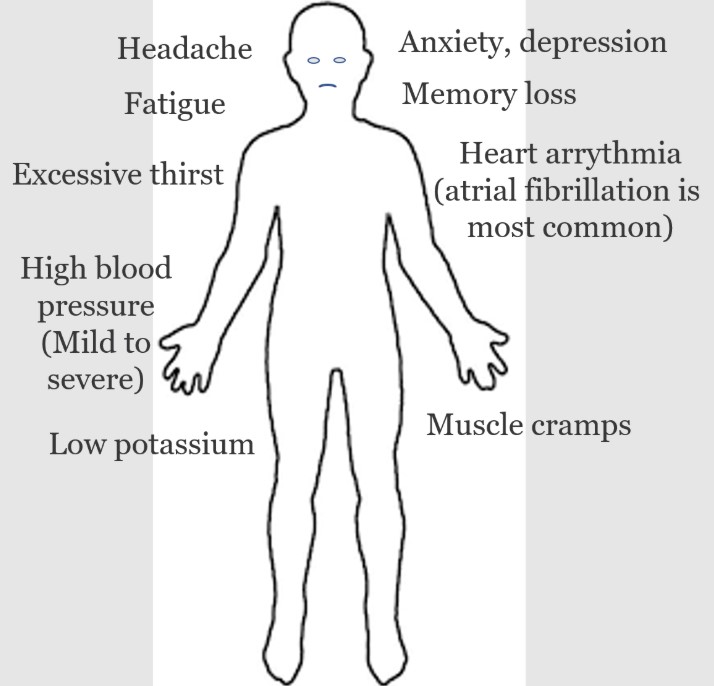 The oversecretion of aldosterone results in excess sodium in the blood, hypervolemia, and hypokalemia. Diastolic hypertension may occur without edema, and headaches may ensue. In addition, polyuria, polydipsia, and nocturia may also occur. These changes are manifested in weakness, numbness, transient paralysis, and possible tetany. However, a great number of cases manifest only in modest hypertension.
