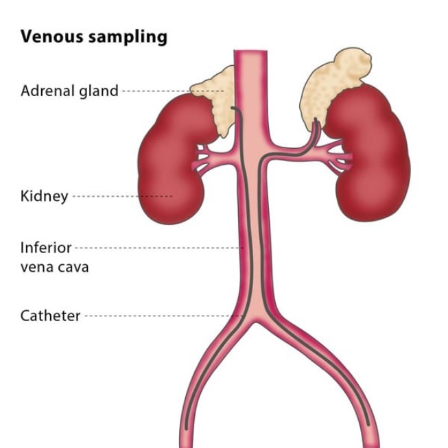 Sodium and potassium levels are determined to indicate hypernatremia and hyperkalemia. An improvement in hypertension symptoms after 5 to 8 weeks on a diuretic indicates that the high blood pressure is due to increased aldosterone levels. Measuring plasma renin and aldosterone levels may be helpful to distinguish primary and secondary forms of the condition. Venous sampling of both adrenals is used in the localization of adenomas. Computed tomography (CT) scan may show a small adenoma.