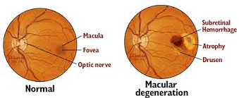 Macular degeneration - There are no predisposing systemic risk factors known, but age-related macular degeneration may be hereditary, and smoking may be a risk factor. In age-related atrophic macular degeneration (dry form), there is pigmentary disturbance in the macular region but no elevated macular scar, and no bleeding or oozing of fluids in the region of the macula. In exudative macular degeneration (wet form), there is the formation of a network of new growth in the vascular layer below the retina often associated with bleeding within the retina, fluid below the retina, pigment epithelial detachment, and increased pigmentation, leaving a distinct scar.